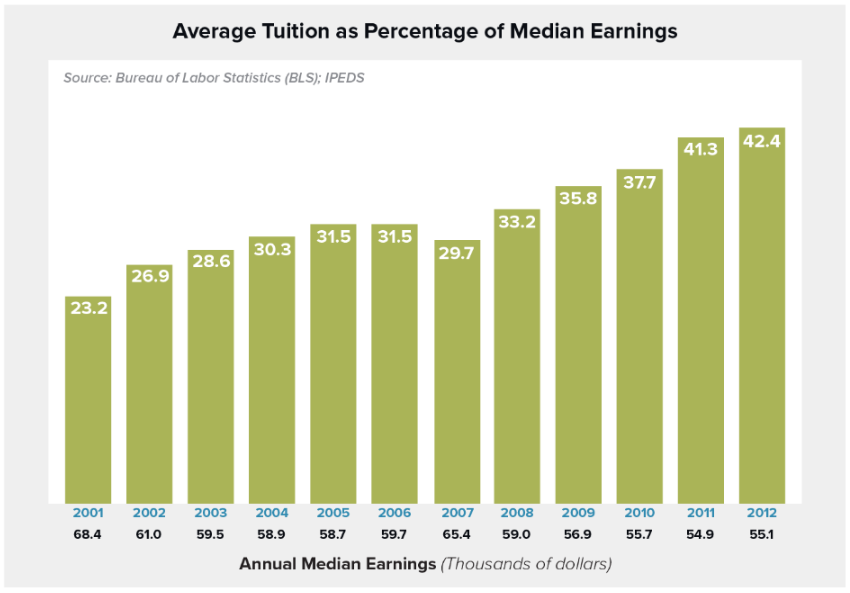 The chart captures the devastating impact of stagnant family incomes in this century combined with an out-of-control increase in the price of tuition. The percentage of a middle class family’s income devoted to tuition has almost doubled since 2001, rising to an unacceptable 42.4%. In the three years from 2010 to 2012 alone, the percentage increased by 13 points. Meanwhile, the percentage of households making more than $100,000 has been shrinking, while the proportion earning less than $35,000 has grown. The problem of stagnant household income is particularly acute among those families with children who will be interested in attending college over the next ten years. According to one analysis, of the 450 counties in the U.S. with significantly more younger than older children, all but 100 of them have median incomes below the national average.